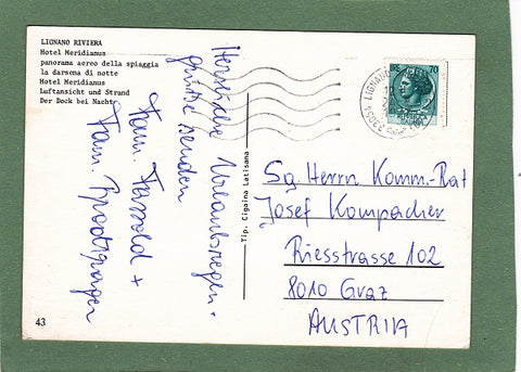 AK Lignano. Hotel Meridianus. Gelaufen 1977 in Lignano Sabbiadoro. Großformat. Verlag: Cigaina Latisana. Nummeriert: 43. Zustand: rechtes oberes Eck geknickt, andere Ecken angeknickt bzw. etwas bestoßen, sonst O.K.