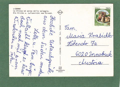 AK Lignano. La Chiesa ed aerea della spiaggia. Ungelaufen, aber beschrieben mit Briefmarke. Großformat. Verlag: Cigaina Latisana. Zustand: gut, geringe Läsuren an Ecken, leichter Knick am unteren Rand ca. Mitte.