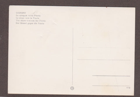 AK Lignano. La spiaggia verso Pineta. Ungelaufen. Großformat. Nummeriert: 413. Zustand: rechte obere Hälfte bestoßen.