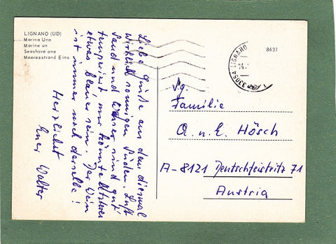 AK Lignano. Marina Uno. Gelaufen, aber Briefmarke wurde entfernt. Großformat. Zustand: Ecken angeknickt bzw. etwas bestoßen, sonst leichte Läsuren.