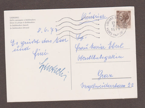 AK Lignano. Nella spiaggia a Sabbiadoro. Gelaufen 1973. Großformat. Zustand: gut, linkes oberes Eck angeknickt.
