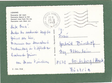 AK Lignano. Panorama dal mare. Gelaufen 1969 in Lignano Sabbiadoro, aber Briefmarke wurde entfernt. Großformat. Verlag: CILA. Nummeriert: 2. Zustand: untere Ecken geknickt, knittrig, leichte Randläsuren.