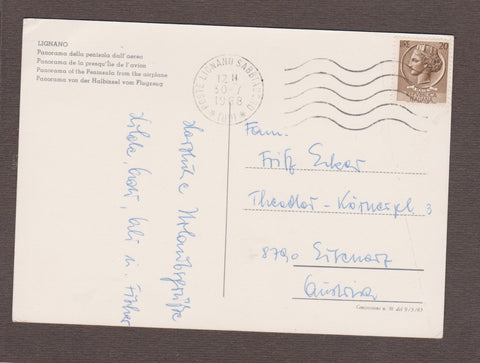 AK Lignano. Panorama della penisola dall'aereo. Gelaufen 1968. Großformat. Zustand: rechtes oberes Eck doppelt geknickt, sonst leichte Läsuren.