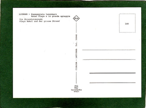 AK Lignano – Passeggiata Lungomare. Hotel Playa e la grande spiaggia. Ungelaufen. Großformat. Verlag: Cigaina Latisana. Nummeriert: 108. Zustand: gut.