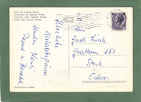 AK Lignano Pineta. Gelaufen 1965 in Lignano Sabbiadoro. Großformat. Zustand: rechtes oberes Eck doppelt geknickt, linkes oberes Eck angeknickt, andere Ecken leicht angestoßen, Stempeldrucklinien.