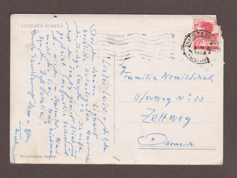 AK Lignano Pineta. Gelaufen. Großformat. Zustand: stark bestoßen, vom linken oberen Teil ein Stück weggerissen.