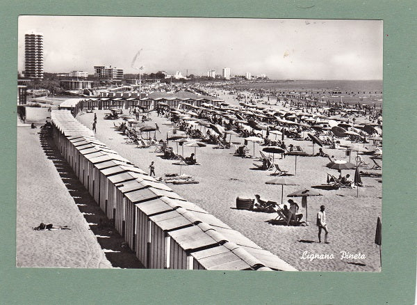 AK Lignano Pineta. Gelaufen 1963 in Lignano Sabbiadoro. Großformat. Zustand: gut, linke Ecken leicht angestoßen, leicht fleckig in rechter oberer Hälfte, sonst O.k.