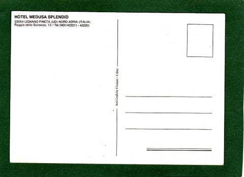 AK Lignano Pineta. Hotel Medusa Splendid. Raggio dello Scirocco, 13. Ungelaufen. Großformat. Verlag: Arti Grafiche Friuliane Udine. Zustand: Ecken wenig angestoßen, Knick am rechten Rand in der oberen Hälfte, leichter vertikaler Knick parallel zum rechten Eck vom oberen Rand ausgehend ca. 3cm, sonst O.k.
