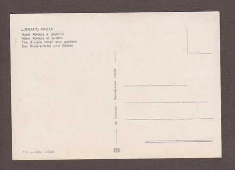 AK Lignano Pineta. Hotel Riviera e giardini. Ungelaufen. Großformat. Verlag: CILA. Nummeriert: 111. Zustand: Oberfläche leicht knittrig.