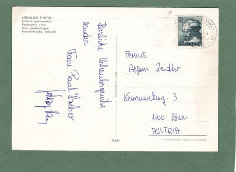 AK Lignano Pineta. Scorcio panoramico. Gelaufen 1966 in Lignano Sabbiadoro. Großformat. Nummeriert: 16081. Zustand: rechte Ecken angeknickt, linke Ecken gering angestoßen, zwei horizontaleStempeldrucklinien (Abstand ca. 4 cm).