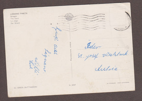 AK Lignano Pineta. Spiaggia. Gelaufen, aber Briefmarke wurde entfernt. Großformat. Verlag: Eredi Buttazzoni. Nummeriert: 5157. Zustand: obere Ecken geknickt, Oberfläche stark knittrig.