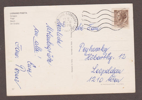 AK Lignano Pineta. Spiaggia. Gelaufen 1970. Großformat. Nummeriert: 57. Zustand: Knick über der oberen Hälfte, Ecken leicht angestoßen.