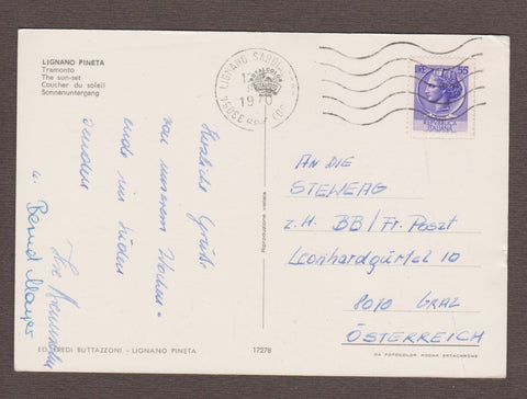 AK Lignano Pineta. Tramonto. Gelaufen 1970. Großformat. Verlag: Buttazzoni. Nummeriert: 17278. Zustand: linkes oberes Eck angeknickt, am linken Rand in unterer Hälfte etwas bestoßen, sonst O.k.