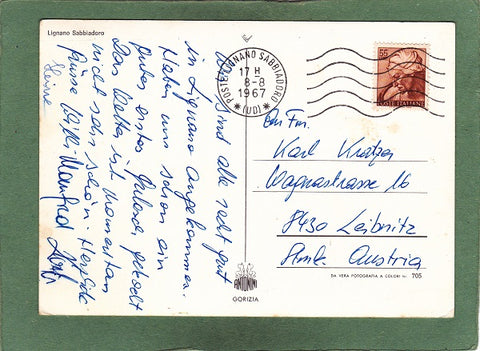 AK Lignano Sabbiadoro. Gelaufen 1967. Großformat. Verlag: Antonini, Gorizia. Nummeriert: 705. Zustand: linkes unteres Eck geknickt, andere Ecken und am Rand leicht angestoßen.