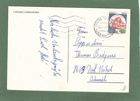 AK Lignano Sabbiadoro. Gelaufen 198? in Lignano Sabbiadoro. Großformat. Zustand: rechtes unteres Eck angeknickt, andere Ecken leicht angestoßen, kleiner Knick in linker oberer Hälfte.