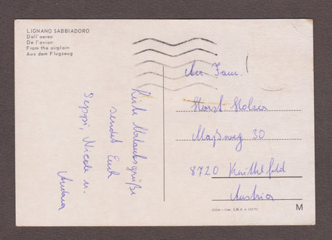 AK Lignano Sabbiadoro. Dall'aereo. Gelaufen, aber Briefmarke wurde entfernt. Großformat. Zustand: linke Bildhälfte gewölbt bzw. gewellt.