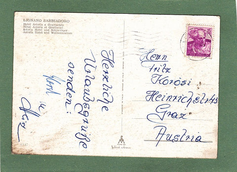 AK Lignano Sabbiadoro. Hotel Astoria e Grattacielo. Gelaufen 1963 in Lignano Sabbiadoro. Großformat. Verlag: GM Milano. Nummeriert: 17. Zustand: leichter Knick über dem rechten oberen Eck, obere Ecken wenig angeknickt, leicht angeschmutzt.