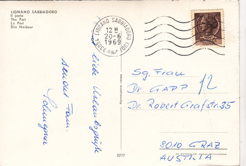 AK Lignano Sabbiadoro. Il Porto. Gelaufen 1969. Großformat. Nummeriert: 5217. Zustand: Knick in Bildmitte, sonst leichte Läsuren.