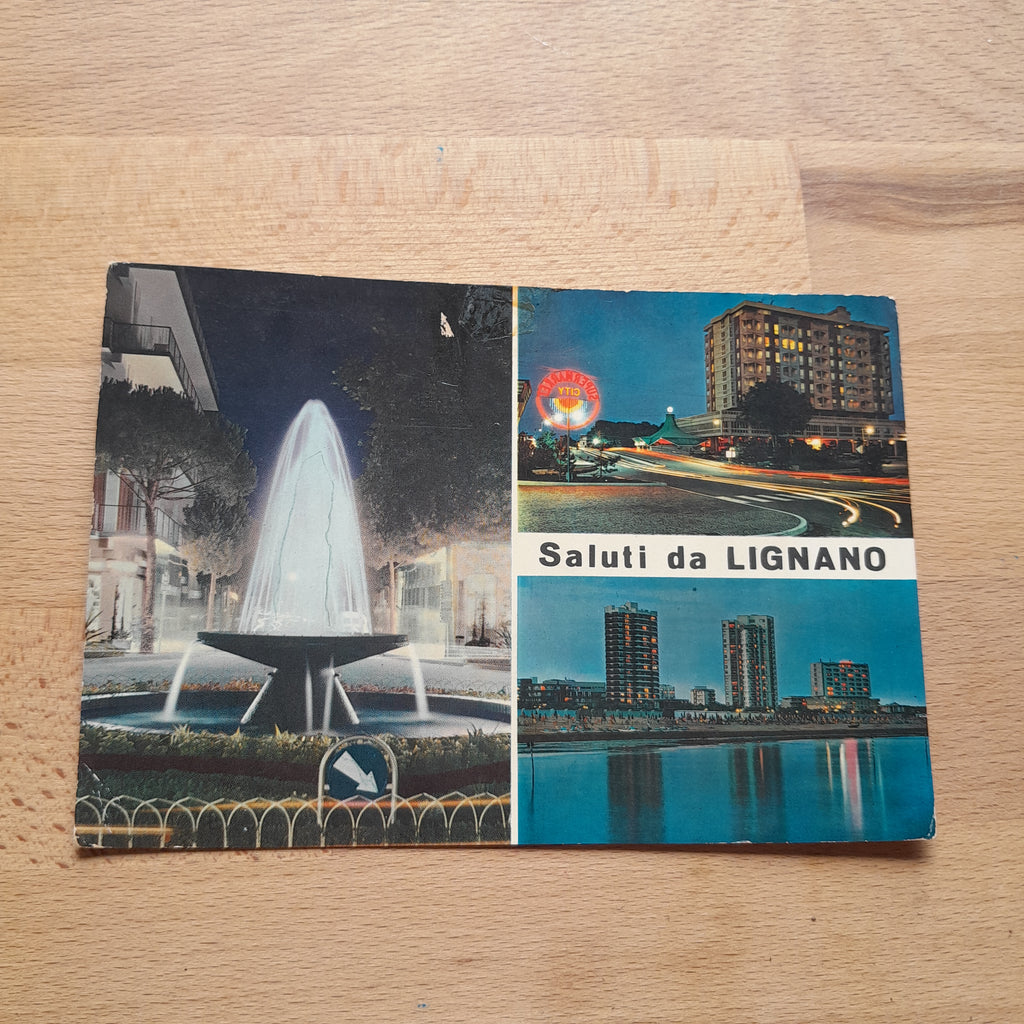 AK Saluti da Lignano. Gelaufen. Großformat. Zustand: leicht bestoßen.