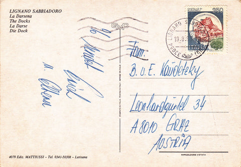 AK Lignano Sabbiadoro. La Darsena. Gelaufen. Großformat. Verlag: Mattiussi. Nummeriert: 4097. Zustand: gut.