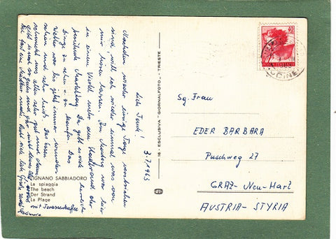 AK Lignano Sabbiadoro. La spiaggia. Gelaufen 1963 in Lignano Sabbiadoro. Großformat. Verlag: Giornalfoto, Trieste. Zustand: obere Ecken geknickt, Knick am oberen Rand etwas links vom rechten Eck, am Rand etwas bestoßen.