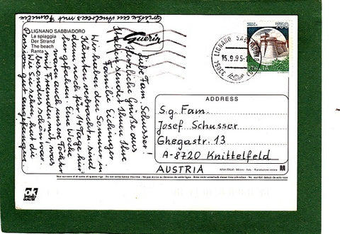 AK Lignano Sabbiadoro. La spiaggia. Gelaufen 1995 in Lignano Sabbiadoro. Großformat. Verlag: KINA ITALIA Milano. Zustand: rechtes unteres Eck mehrfach geknickt, andere Ecken angeknickt.