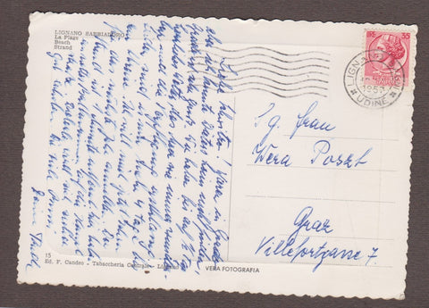 AK Lignano Sabbiadoro - La spiaggia. Gelaufen 1957. Großformat. Verlag: Candeo. Nummeriert: 15. Zustand: Ecken angeknickt, kleiner Einriss am oberen Rand ca. Mitte ca. 2mm.