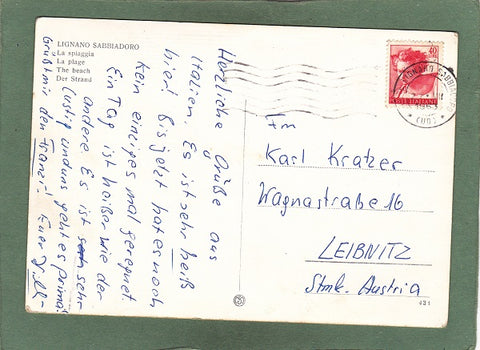 AK Lignano Sabbiadoro. La spiaggia. Gelaufen 1963. Großformat. Verlag: Mazari. Nummeriert: 431. Zustand: zwei kleine Knicke etwas unterhalb der Bildmitte, sonst nur leichte Randläsuren.