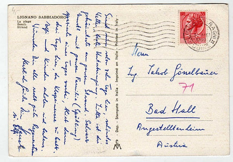 AK Lignano Sabbiadoro - La spiaggia. Gelaufen 1959 in Lignano Bagni. Großformat. Verlag: GM. Nummeriert: 114. Zustand: obere Ecken angeknickt, Stempeldurchdruckspuren, sonst nur leichte Randläsuren.