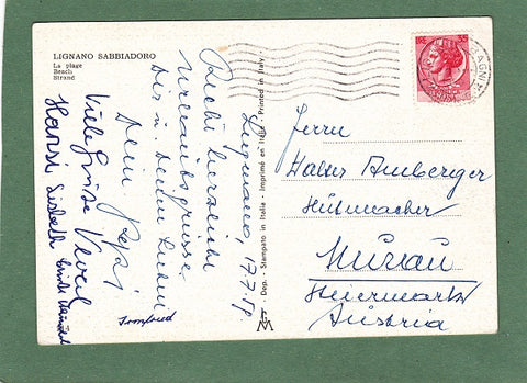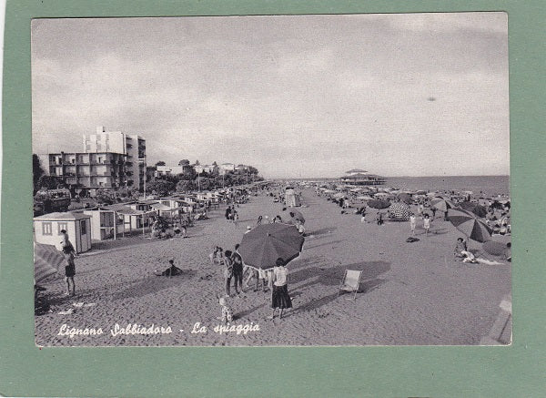 AK Lignano Sabbiadoro – La spiaggia. Gelaufen 1959 in Lignano Bagni. Großformat. Verlag: GM. Nummeriert: 114.Zustand: linkes oberes Eck doppelt geknickt, andere Ecken leicht angestoßen, sonst O.k.