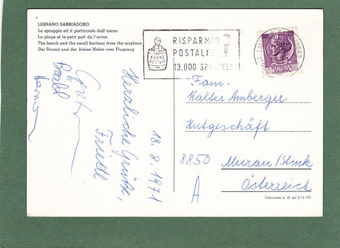 AK Lignano Sabbiadoro. La spiaggia ed il porticciolo dall'aereo. Gelaufen 1971 in Lignano Sabbiadoro. Großformat. Zustand: an Ecken und zum Teil am Rand leicht angestoßen, sonst O.k.