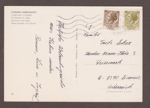AK Lignano Sabbiadoro. Lungomare e spiaggia.Gelaufen 1977. Großformat. Nummeriert: 73. Zustand: gut, linkes unteres Eck geknickt, andere Ecken wenig angestoßen.