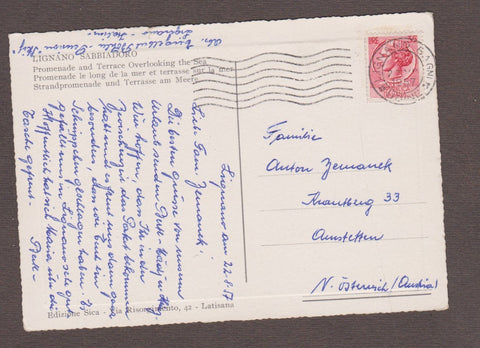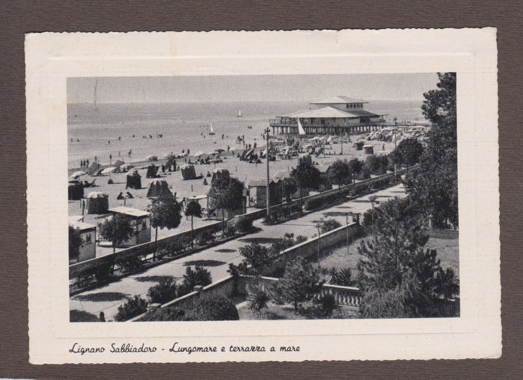 AK Lignano Sabbiadoro - Lungomare e terrazza a mare. Gelaufen 1957. Großformat. Verlag: Sica. Zustand: Einriss am oberen Rand etwas rechts der Mitte ca. 5mm, sonst O.k.