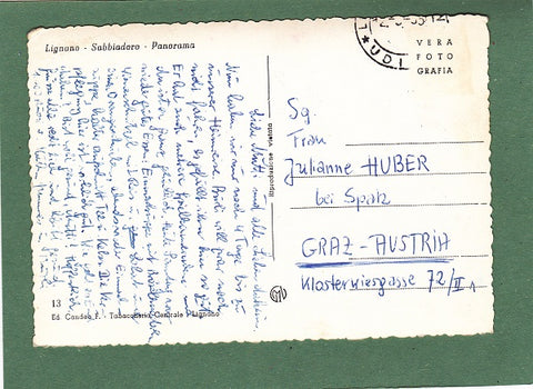 AK Lignano – Sabbiadoro – Panorama. Gelaufen, aber Briefmarke wurde entfernt. Großformat. Verlag: Candeo F. Tabaccheria Centrale Lignano. Zustand: rechtes oberes Eck geknickt, linkes oberes Eck leicht angestoßen, sonst O.k.