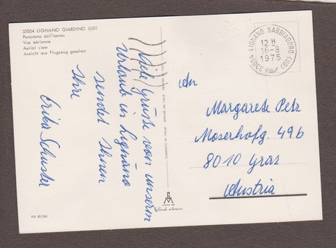 AK Lignano Sabbiadoro. Panorama dall'aereo. Gelaufen 1975, aber Briefmarke wurde entfernt. Großformat. Nummeriert: BIB 80/260. Zustand: linke Bildhälfte stärker gewölbt.