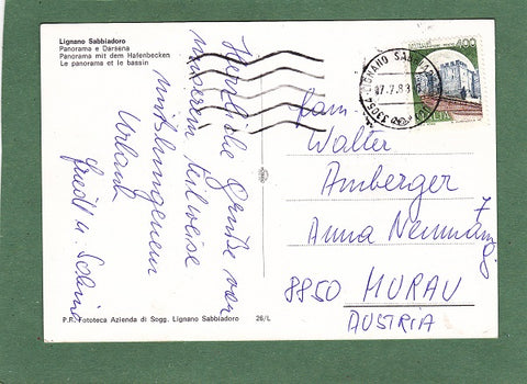 AK Lignano Sabbiadoro. Panorama e Darsena. Gelaufen 1988 in Lignano Sabbiadoro. Großformat. Verlag: P.R. Fototeca Azienda di Sogg. Lignano Sabbiadoro. Nummeriert: 26. Zustand: an Ecken leicht angeknickt, leichte Stempeldruckspuren, sonstO.k.
