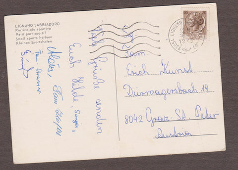 AK Lignano Sabbiadoro. Porticciolo sportivo. Gelaufen 1973. Großformat. Zustand: stärker bestoßen, Fleck rechts oben.