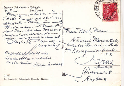 AK Lignano Sabbiadoro - Spiaggia. Gelaufen. Großformat. Verlag: Candeo. Nummeriert: 21777. Zustand: linkes unteres Eck geknickt, sonst leichte Läsuren.