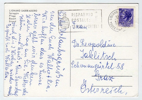 AK Lignano Sabbiadoro Spiaggia. Gelaufen 1971 in Lignano Sabbiadoro. Großformat. Zustand: linke Ecken angeknickt, leichter Einriß am linken Rand oben 2-3mm, sonst leichte Randläsuren.