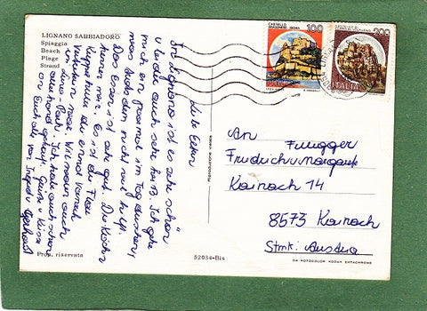 AK Lignano Sabbiadoro. Spiaggia. Gelaufen 1981 in Lignano Sabbiadoro. Großformat. Nummeriert: 52034. Zustand: linkes unteres Eck geknickt, Ecken etwas angeknickt bzw. angestoßen, Kratzer im linken oberen Eck.