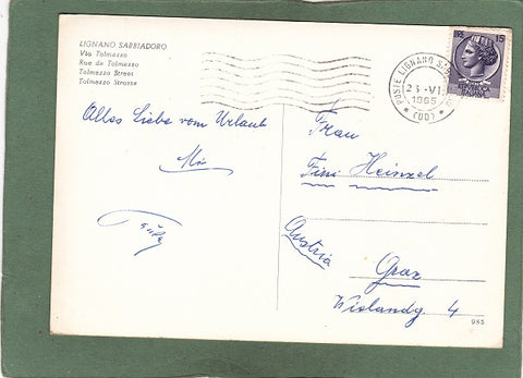 AK Lignano Sabbiadoro. Via Tolmezzo. Gelaufen 1965. Großformat. Nummeriert: 985. Zustand: gut, linkes unteres Eck etwas angestoßen, sonst geringe Läsuren.
