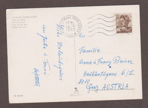 AK Lignano Sabbiadoro. Vita al mare. Gelaufen 1967. Großformat. Nummeriert: LI 44/124. Zustand: rechtes oberes Eck geknickt, Knick oberhalb der Bildmitte, leicht fleckig.