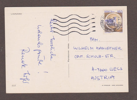 AK Lignano Souvenir. Gelaufen 1981. Großformat. Nummeriert: 212. Zustand: gut, rechtes oberes Eck angeknickt.