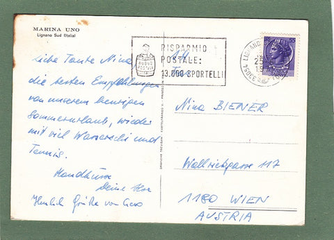 AK Lignano Sud. Marina Uno. Gelaufen 1971 in Lignano Sabbiadoro. Großformat. Verlag: Grafiche Trevisan Castelfranco Veneto. Zustand: linkes oberes Eck geknickt, Ecken etwas bestoßen, etwas fleckig.
