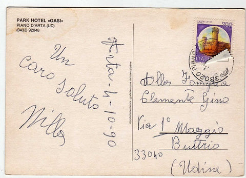 AK Piano D'Arta, Park Hotel Oasi. Gelaufen 1990, Briefmarke beschädigt. Großformat. Verlag: Grafiche nuova del bianco/Udine. Zustand: Ecken leicht angestoßen, auf Rückseite oben links wasserfleckig, sonst O.k.