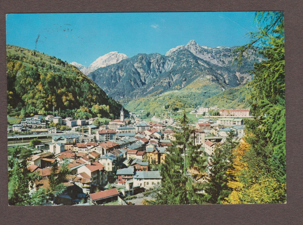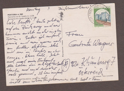 AK Pontebba. Panorama con M. Cavallo. Gelaufen. Großformat. Verlag: Cartolnova. Nummeriert: 316. Zustand: rechtes oberes Eck geknickt, Knick am unteren und am oberen Rand jeweils in der rechten Hälfte.