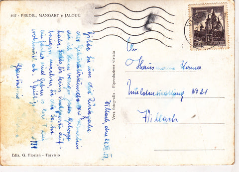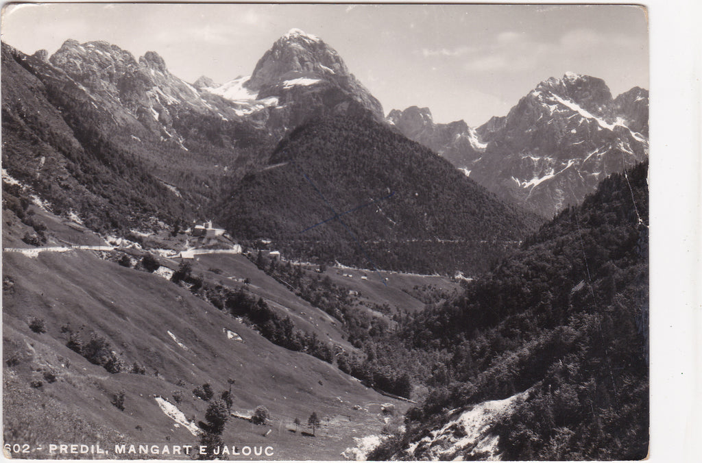 AK Predil, Mangart e Jalouc. Gelaufen 1958. Großformat. Verlag: Florian. Nummeriert: 602. Zustand: stark bestoßen.