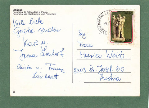AK Saluti da Lignano. Gelaufen 1975 in Marano Lagunare. Großformat. Nummeriert: 89. Zustand: Ecken angeknickt bzw. bestoßen, rechtes unteres Eck geknickt, leichter Knick am linken Rand in der unteren Hälfte, zwei Knicke am oberen Rand in der linken Hälfte, durch den Stempel verursacht.