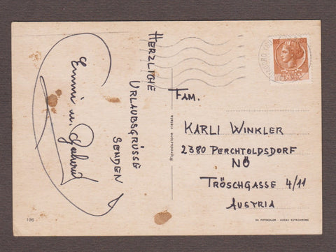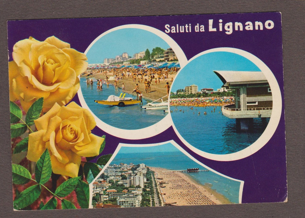 AK Saluti da Lignano. Gelaufen. Großformat. Nummeriert: 196. Zustand: untere Ecken angeknickt, Rückseite fleckig.