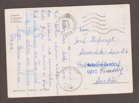 AK Saluti da Lignano. Gelaufen 1967, aber Briefmarke wurde entfernt. Großformat. Verlag: Multifoto. Nummeriert: 196. Zustand: stärker bestoßen.